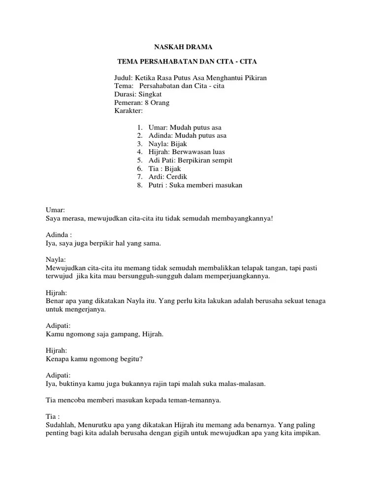Naskah drama 5 orang tema persahabatan narator yubi dan sonny merupakan . Sudah beberapa bulan ini orang tuaku tidak akur. Contoh teks naskah drama pendek persahabatan yang dimainkan 4, 5, 6, 7, 8, 10 orang. Ini adalah pagi yang cerah. Pada suatu pagi hari, terdapat 2 siswa yang sedang .
